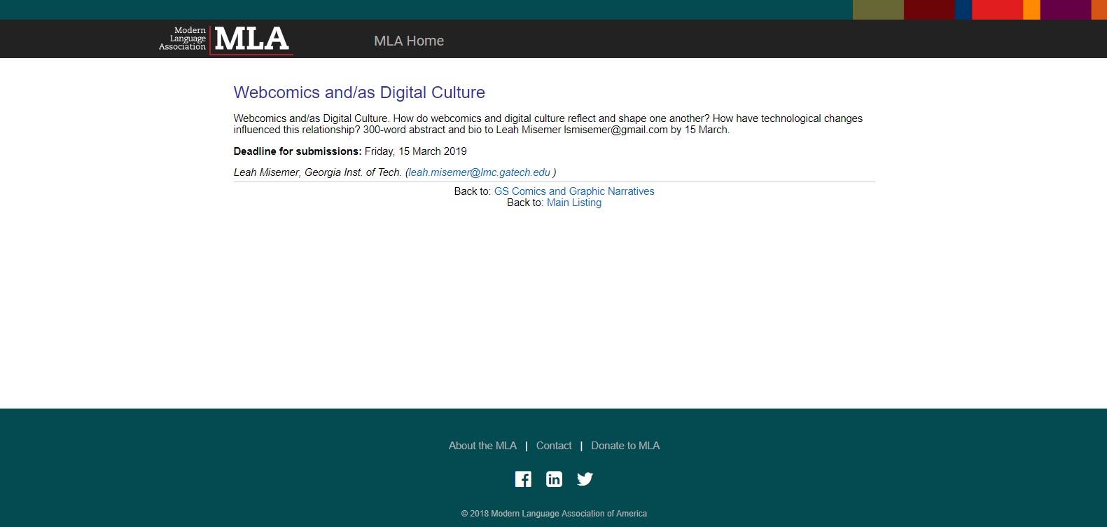 “Presentation: Webcomics and/as Digital Culture (2020 MLA Annual Convention).” Modern Language Association of America, 7 Feb. 2019, mla.confex.com/mla/2020/webprogrampreliminary/Paper8598.html.