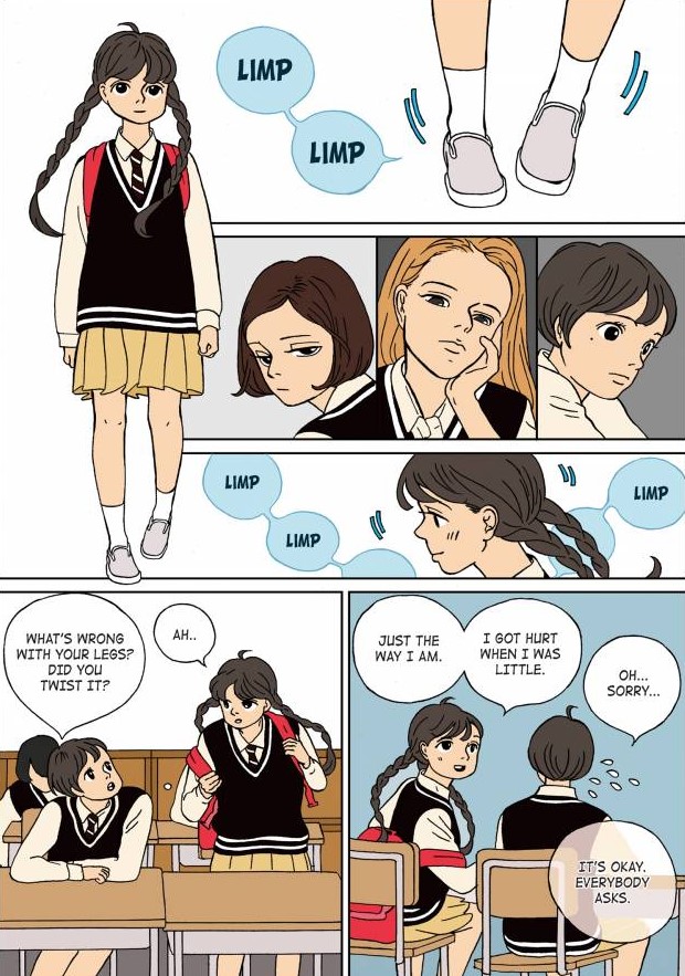 Naeun, the main character, is funny and absolutely adorable. Her character seems authentic like an actual girl any reader can relate to. It is also notable to mention she is a character with a disability. She has a limp which she got when she was a child due to some accident. I think it is amazing to have a disabled character as the main character of a webtoon without making her into a stereotype. Disability and disabled characters are underrepresented in webtoons.