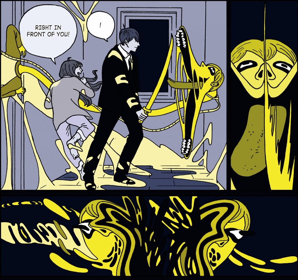 “On the first day at the new school in a suburb, Naeun learns about yellow ghosts appearing in the area. And, they appear in her new house that same night. Naeun’s homeroom teacher comes to kill them with a sword taken out of his chest.”