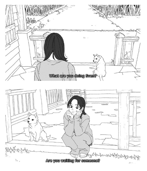 Mae & Hilde also doesn’t use speech bubbles but caption-like dialogue as well as the frame by frame image format with no extended panels which most webtoons contain. The black border adds an effect reminiscent of a cinematic experience similar to Of What Remains, but it also goes to match the tone of the story, which is dark and mysterious.